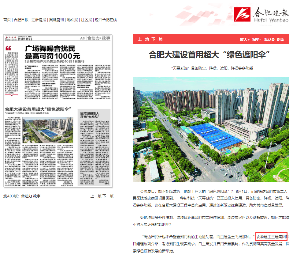 近日,中国新闻网、学习强国、安徽新闻联播、安徽日报、合肥新闻联播、合肥日报、合肥晚报聚焦公司自主研发的“天幕系统”在合肥大建设工程中首次启用,用创新驱动绿色建造,助力城市高质量发展,受到广泛关注。